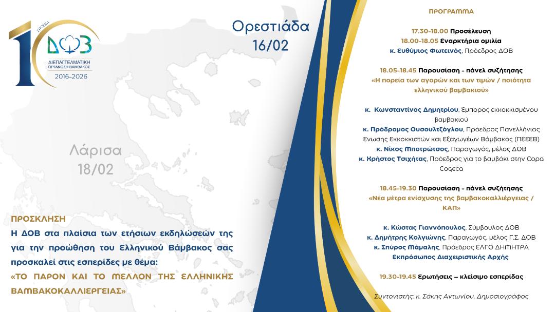Τη Δευτέρα 16 Φεβρουαρίου και ώρα 18.00 (προσέλευση: 17.30) θα πραγματοποιηθεί η 1η εσπερίδα της Διεπαγγελματικής Οργάνωσης Βάμβακος για το 2026, στην Ορεστιάδα («Δημοκρίτειο Πανεπιστήμιο Θράκης», Αμφιθέατρο «Ζαφείρης Άμπας») με τίτλο: «Το παρόν και το μέλλον της ελληνικής βαμβακοκαλλιέργειας» στα πλαίσια των ετήσιων εκδηλώσεων της Διεπαγγελματικής για την προώθηση του Ελληνικού Βαμβακιού.