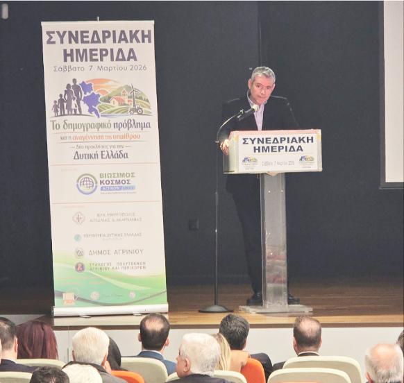 Με επιτυχία πραγματοποιήθηκε το Σάββατο 7 Μαρτίου 2026 στο Αγρίνιο ημερίδα με θέμα «Το Δημογραφικό Πρόβλημα και η Αναγέννηση της Υπαίθρου – Δύο Προκλήσεις για τη Δυτική Ελλάδα».