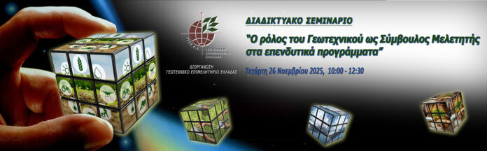 Το Γεωτεχνικό Επιμελητήριο Ελλάδας (ΓΕΩΤ.Ε.Ε.) διοργανώνει Διαδικτυακό Σεμινάριο με τίτλο: «Ο ρόλος του Γεωτεχνικού ως Σύμβουλος Μελετητής στα επενδυτικά προγράμματα», την Τετάρτη 26 Νοεμβρίου 2025, στις 10:00 π.μ.. Το σεμινάριο θα μεταδοθεί ζωντανά, διαδικτυακά, από το κανάλι του ΓΕΩΤ.Ε.Ε. στο Youtube. Υπάρχει δυνατότητα οnline εγγραφής – συμμετοχής στο σεμινάριο.