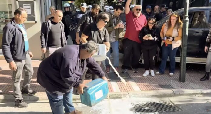 Υπό την επιτήρηση ισχυρών αστυνομικών δυνάμεων οι κτηνοτρόφοι έριξαν το γάλα στο οδόστρωμα χαρακτηρίζοντας «ανεπιθύμητους στη Θεσσαλία» τα κυβερνητικά στελέχη.