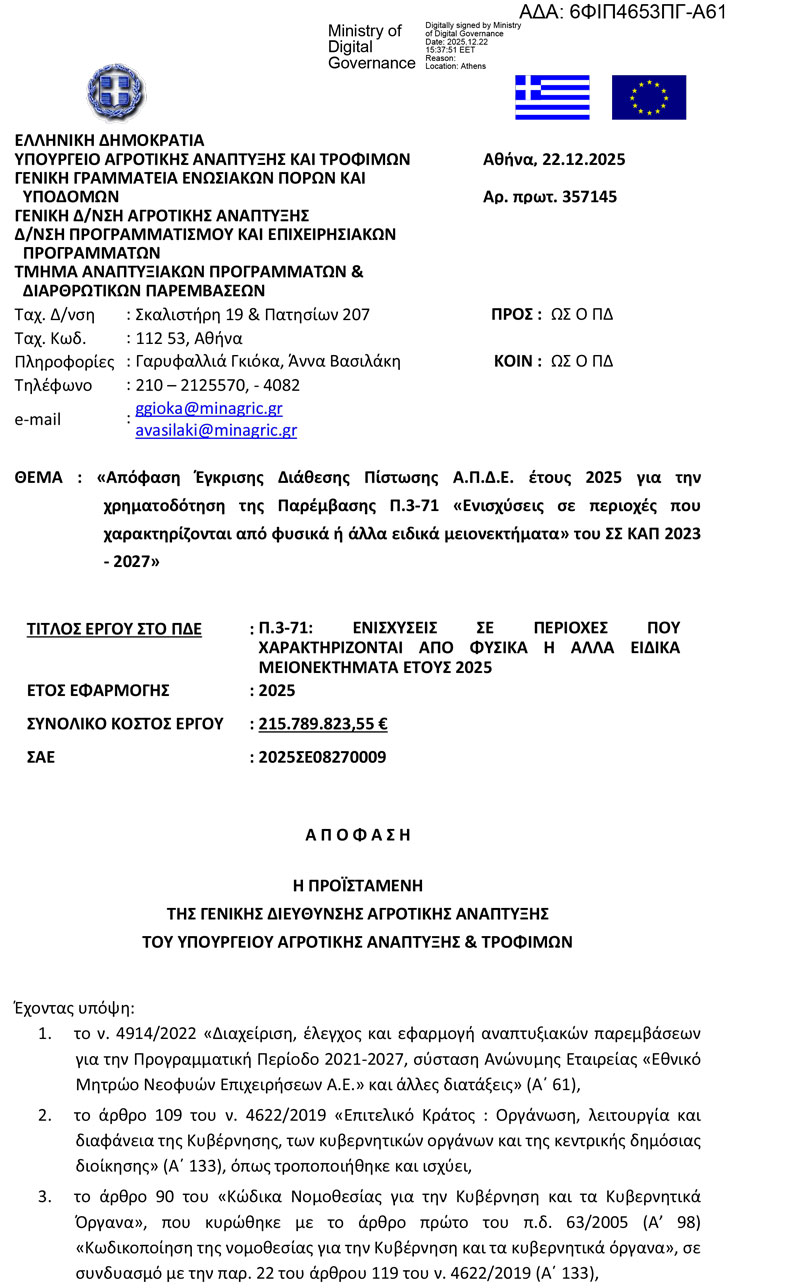 2025ΣΕ08270009 και με τίτλο «Π.3-71: ΕΝΙΣΧΥΣΕΙΣ ΣΕ ΠΕΡΙΟΧΕΣ ΠΟΥ ΧΑΡΑΚΤΗΡΙΖΟΝΤΑΙ