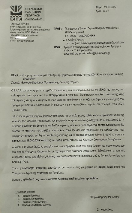 ΘΕΜΑ: ΕΛΓΑ προς Δημάρχους του Νομού Σερρών – 77.000.000 ευρώ η εκτιμώμενη δαπάνη για τα χειμερινά σιτηρά σε επίπεδο χώρας – Πρόγραμμα ad hoc