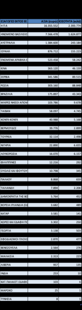 Ακολουθεί η κατάταξη των χωρών της ΕΕ και Τρίτων Χωρών με βάση το κριτήριο της αξίας εξαγωγών ελληνικών οίνων για το 2025.