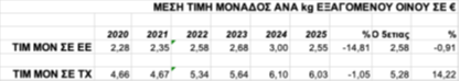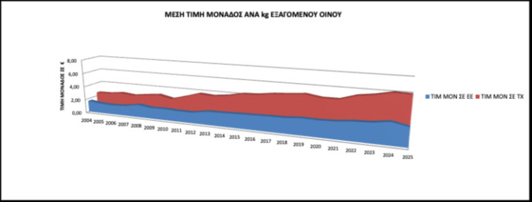 Τέλος συνεπεία των ανωτέρω μετά από πολλά χρόνια (2010) μειώνεται η μέση τιμή μονάδος, ανά εξαγόμενο  κιλό οίνου προς Τρίτες Χώρες. Το 2025 παρουσιάζει  ελαφρά μείωση κατά 1,05% (6,03 €/kg/2025 – 6,10 €/kg/2024), ενώ αυξητική τάση της μέσης τιμής μονάδος καταγράφεται σε σχέση και με την προηγούμενη 5ετία, με αύξηση  που ανέρχεται σε 14,22% (Μέσος Όρος τιμής 5ετίας 5,28 €/kg), γεγονός που σταθεροποιεί την διαχρονική άνοδο της μέσης τιμής.
