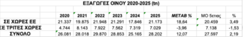Η εικόνα των αντίστοιχων μεγεθών εξαγωγών ελληνικού οίνου προς Τρίτες χώρες, δεν ακολουθεί την πορεία των εξαγωγών στην ΕΕ, σε αξία και ποσότητα το 2025.