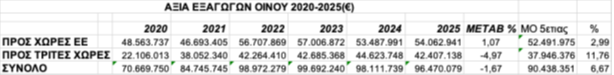 Σε επίπεδο αξίας το 2025 τα μεγέθη, ακολουθούν τις μεταβολές των ποσοτήτων αφού κινούνται με αρνητικό ρυθμό επιδόσεων και το 2025 αφού καταγράφεται μείωση των εξαγωγών σε αξία προς Τρίτες Χώρες που ανέρχεται σε ποσοστό 4,97% (42.407.138 €/2025 – 44.623.748 €/2024).