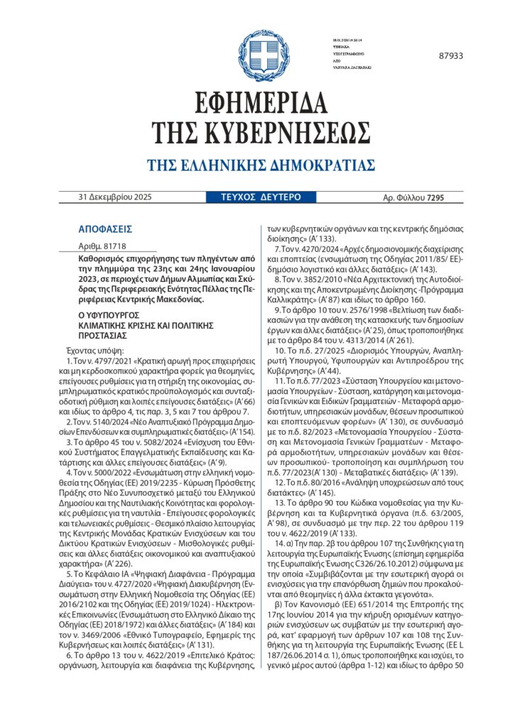 Καθορισμός επιχορήγησης των πληγέντων από την πλημμύρα της 23ης και 24ης Ιανουαρίου
