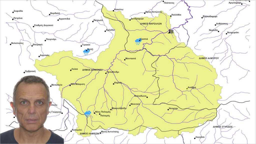Εικόνα 1. Η απεικόνιση, της «λεκάνης απορροής» (επιφάνεια με «ανοιχτή πράσινη» απόχρωση) (του «”Ενιπέα Ποταμού” πουαντιστοιχεί έως την θέση στην οποία πρόκειται να κατασκευαστεί το«Φράγμα Ποταμού Ενιπέα (“Σκοπιάς”) (στην θέση “Παλιοδερλί”)», η οποία βρίσκεται στην κατάντη πλευρά του οικισμού «Σκοπιά» του «Δήμου Φαρσάλων»), του «υδρογραφικού (γραμμικού) δικτύου» (γραμμές με «έντονη μπλε» απόχρωση με διαβάθμιση του πάχους της γραμμής, όπου το πάχος της κάθε γραμμής εξαρτάται από την “τάξη” του εκάστοτε ρέματος που αντιπροσωπεύει δηλαδή όσο μεγαλύτερη είναι η “τάξη” του ρέματος τόσο παχύτερη είναι και η αντίστοιχη γραμμή που το αντιπροσωπεύει), των «οικισμών του Δήμου Φαρσάλων», των «οικισμών του Δήμου Δομοκού», των «οικισμών του Δήμου Αλμυρού». των «οικισμών του Δήμου Λαμιέων», και των «οικισμών του Δήμου Στυλίδος» (κουκίδες με «μαύρη» απόχρωση και ονομασία, επίσης, με «μαύρη» απόχρωση), του «περιγράμματος του “Δήμου Φαρσάλων”», του «περιγράμματος του “Δήμου Δομοκού”», του «περιγράμματος του “Δήμου Αλμυρού”», του «περιγράμματος του “Δήμου Λαμιέων”», του «περιγράμματος του “Δήμου Στυλίδος”» (γραμμές με «μαύρη» απόχρωση), της θέσης του φράγματος (θεματικό εικονίδιο «φράγμα με νερό στην μία πλευρά του» με «μαύρη» απόχρωση) και των μετεωρολογικών σταθμών «Βουζίου, Δομοκού, Φθιώτιδας», «Σκοπιάς, Φαρσάλων, Λάρισας» και «Νέου Παλαμά, Δομοκού, Φθιώτιδας» (θεματικό εικονίδιο «σύννεφο με βροχή» με «γαλάζια» απόχρωση), όπως απεικονίζονται στο «ελεύθερο διαδικτυακά λογισμικό» «Q.G.I.S.» [4], μέσω των σχετικών αρχείων που ανακτήθηκαν τόσο από την σχετική διαδικτυακή «πλατφόρμα» («Copernicus») όσο και από την σχετική διαδικτυακή «πλατφόρμα» («ΕΛ.ΣΤΑΤ.»),[1,2,4].
