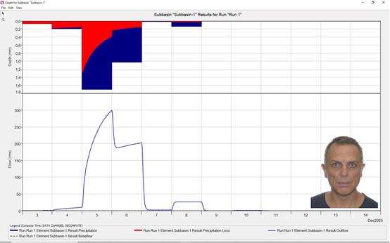 Επιπλέον, αρχικά, στην παρακάτω εικόνα απεικονίζεται το, “προσομοιωμένο ρεαλιστικό”, «διάγραμμα / ιστόγραμμα βροχόπτωσης / απορροής» του χρονικού διαστήματος, “03-10/12/2025” (“150,60 mm”), (το οποίο και «απέδωσε» την, “προσομοιωμένη ρεαλιστική”, ενδεικτική, παροχή αιχμής, ομαλής παροχέτευσης, νερού και συγκεκριμένα «300,00 κυβικά μέτρα ανά δευτερόλεπτο» ή αλλιώς «300,00 m3/sec»), [το οποίο και «απέδωσε», λόγω της, συγκεκριμένης αλληλουχίας, βροχόπτωσης, την, “προσομοιωμένη ρεαλιστική”, συνολική ποσότητα νερού, συγκεκριμένα, «40.002.300 κυβικά μέτρα (τόνους νερού)» ή αλλιώς «40.002.300 m3 (τόνους νερού)»], και το αντίστοιχο, “προσομοιωμένο ρεαλιστικό”, «υδρογράφημα πλημμύρας» που προκύπτει από το συγκεκριμένο, “προσομοιωμένο ρεαλιστικό”, επεισόδιο, συγκεκριμένης αλληλουχίας βροχόπτωσης, με την αντιστοιχισμένη κωδική ονομασία «Byron» (η ανάλυση και οι υπολογισμοί έγιναν με το ελεύθερο στο διαδίκτυο λογισμικό «HEC–HMS» του «U.S.A. Army Corps of Engineers» δηλαδή του «Σώματος Μηχανικών του Στρατού των Η.Π.Α.») [1,2,4,5,6.1-6.3,7.1].