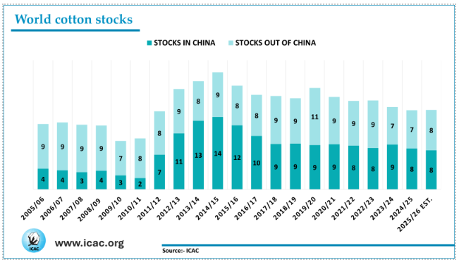 Με τις παγκόσμιες μετρήσεις ζήτησης και προσφοράς χνούδι βαμβακιού για το 2025/26 να παραμένουν συγκρίσιμες με τον προηγούμενο μήνα – παραγωγή στους 25.43 εκατομμύρια τόνους και κατανάλωση στους 25.4 εκατομμύρια τόνους – η μεγαλύτερη εξέλιξη αφορά τα τελικά αποθέματα, που αναμένεται να είναι τα χαμηλότερα από το 2011/12. Η μείωση των αποθεμάτων κατά 3,8%, στους 15,37 εκατομμύρια τόνους, οφείλεται κυρίως στην Κίνα, της οποίας τα τελικά αποθέματα για το 2024/25 μειώθηκαν κατά 9% στους 7,89 εκατομμύρια τόνους. Η χρήση αποθεμάτων είναι ο κύριος λόγος που οι εισαγωγές της Κίνας μειώθηκαν κατά 65% σε 1,1 εκατομμύρια τόνους. Για το 2025/26, η Κίνα ανακοίνωσε ότι θα εκδώσει 200,000 τόνους ποσοστώσεων εισαγωγής βαμβακιού με συρόμενο δασμολογικό συντελεστή σε κλωστοϋφαντουργικές επιχειρήσεις για να καλύψει τις ανάγκες τους σε βαμβάκι, όπως και πέρυσι.