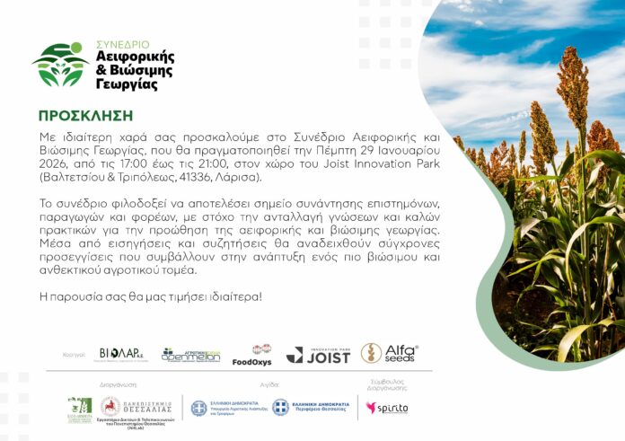 Στο πλαίσιο της συνεχούς προσπάθειας για μια βιώσιμη, ανθεκτική και καινοτόμο γεωργία, , θα πραγματοποιηθεί  το Συνέδριο Αειφορικής και Βιώσιμης Γεωργίας, την Πέμπτη 29 Ιανουαρίου 2026, από 17:00 έως 21:00, στον πολυχώρο JOIST (Βαλτετσίου & Τριπόλεως, Λάρισα).