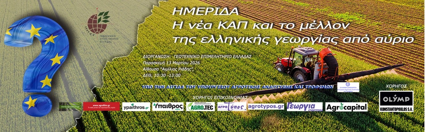Το Γεωτεχνικό Επιμελητήριο Ελλάδας (ΓΕΩΤ.Ε.Ε.) διοργανώνει ενημερωτική ημερίδα με τίτλο: «Η νέα ΚΑΠ και το μέλλον της ελληνικής γεωργίας από αύριο», στη Δ.Ε.Θ., αίθουσα «Αιμίλιος Ριάδης», την Παρασκευή 13 Μαρτίου 2026, στις 10:30 π.μ. Η ημερίδα θα μεταδοθεί ζωντανά, διαδικτυακά, από το κανάλι του ΓΕΩΤ.Ε.Ε. στο Youtube.
