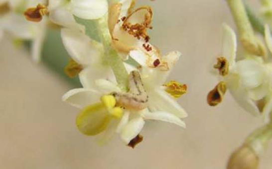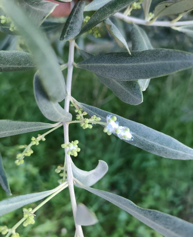 Αυτή την εποχή αρχίζουν να σχηματίζονται πάνω στην τρυφερή βλάστηση και κυρίως πάνω στις αναπτυσσόμενες ανθοταξίες λευκές βαμβακώδεις και κολλώδεις μάζες. Πρόκειται για ομάδες προνυμφών του εντόμου ψύλλα ή βαμβακάδα της ελιάς, οι οποίες τρέφονται μυζώντας χυμούς. Τα λευκά εκκρίματα που περιβάλλουν το σώμα τους, καθώς και τα μελιτώδη απεκκρίματά τους θεωρείται ότι σε μεγάλους πληθυσμούς θα μπορούσαν να εμποδίσουν την άνθηση και την καρπόδεση, αν και κάτι τέτοιο δεν έχει αποδειχθεί.