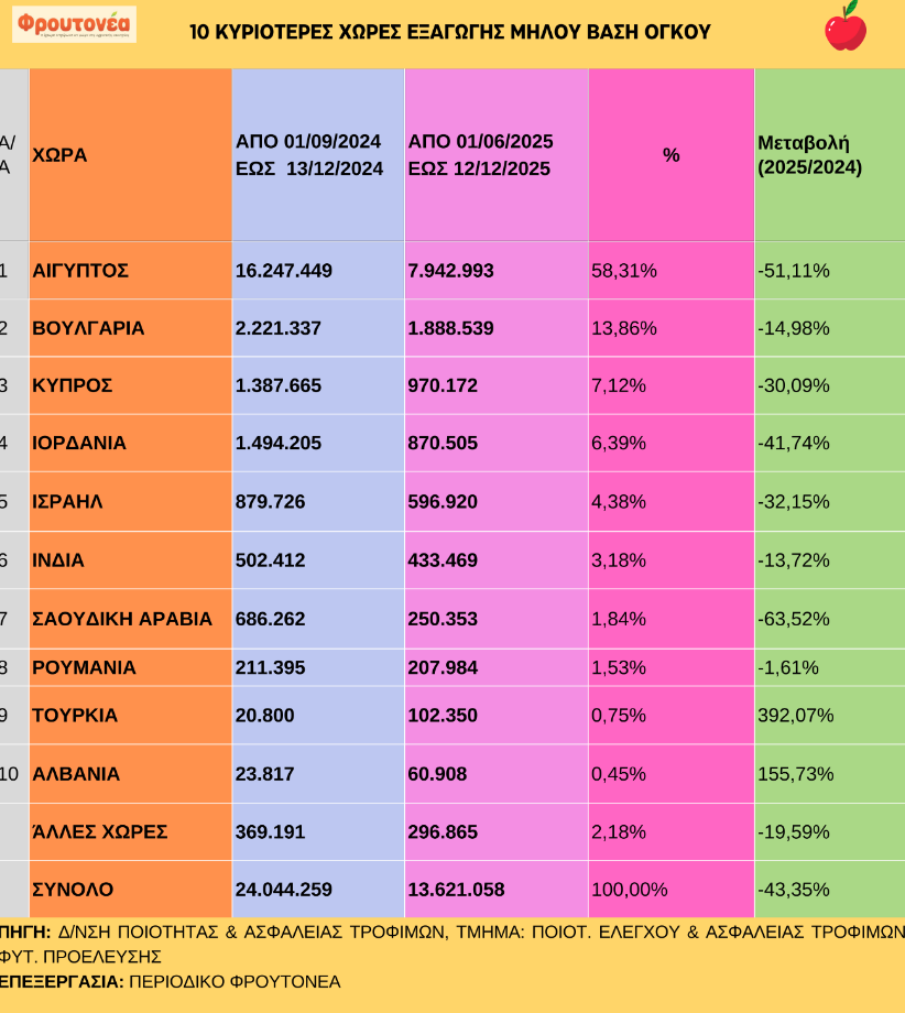 Παρακάτω ακολουθεί ο πίνακας με τις 10 κυριότερες χώρες εξαγωγής μήλου βάση όγκου για τις 12.12.25: