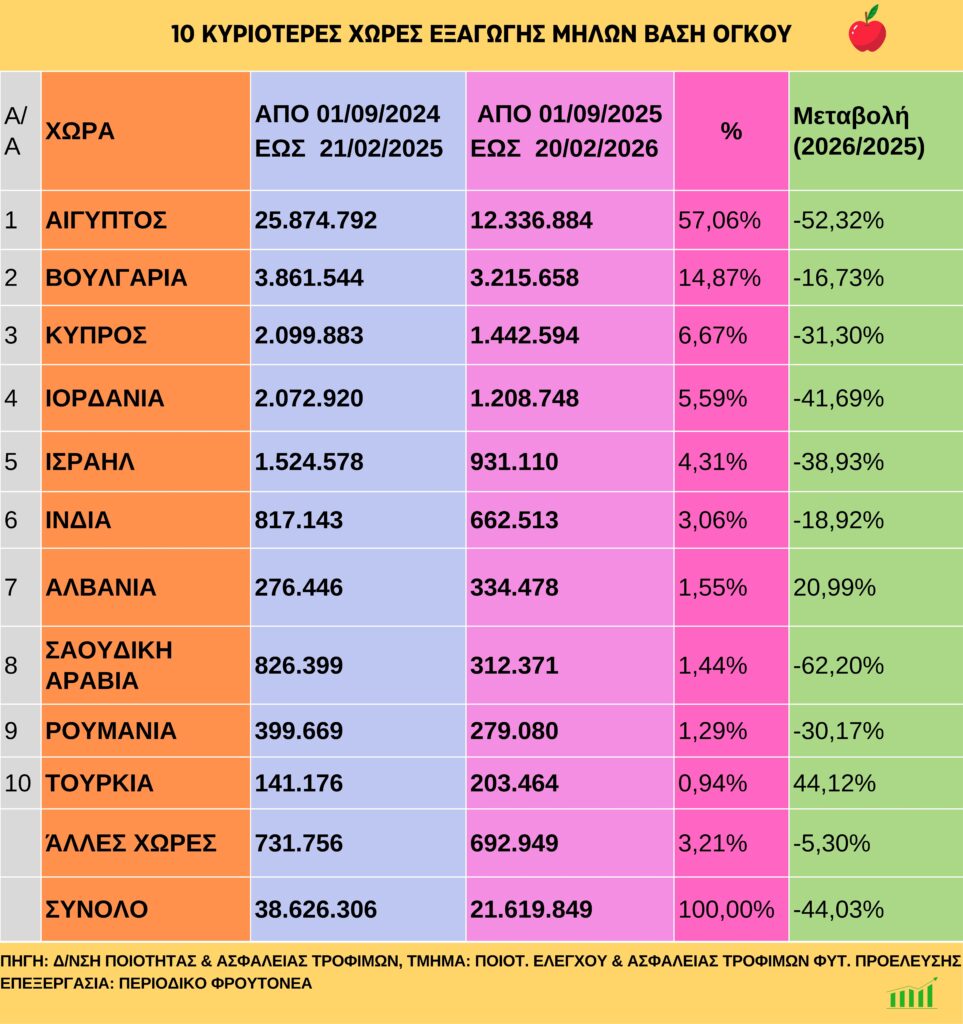 Παρακάτω ακολουθεί ο πίνακας με τις 10 κυριότερες χώρες εξαγωγής μήλου βάση όγκου για τις 20.2.26: