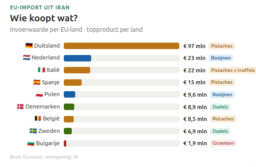 Η Γερμανία είναι μακράν ο μεγαλύτερος εισαγωγέας, με συνολική τιμή εισαγωγής σχεδόν 97 εκατ. ευρώ από το Ιράν. Αυτό είναι περισσότερο από τέσσερις φορές την αξία του δεύτερου μεγαλύτερου εισαγωγέα. Ο ρόλος της Ολλανδίας ως ευρωπαϊκής εμπορικής πύλης είναι επίσης εμφανής, καταλαμβάνοντας τη δεύτερη θέση με περισσότερα από 23 εκατ. ευρώ, ακολουθούμενη από την Ιταλία (22 εκατ. ευρώ) και την Ισπανία (15 εκατ. ευρώ).