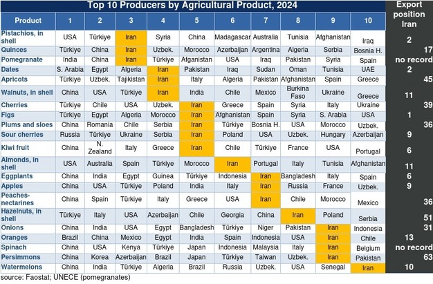 Το Ιράν κατατάσσεται μεταξύ των κορυφαίων 10 παραγωγών φρούτων, λαχανικών και ξηρών καρπών στον κόσμο σε 20 διαφορετικές κατηγορίες (κατά όγκο). Αυτά περιλαμβάνουν φιστίκια, πευκοδάση, ρόδια, χουρμάδες, βερίκοκα, καρύδια, κεράσια, σύκα, δαμάσκηνα, ήθη, ακτινίδια, αμύγδαλα, μελιτζάνες, μήλα, μήλα, κελοκίνητα, φουντούκια, κρεμμύδια, πορτοκάλια, πεπρίμους και καρπούζια, σύμφωνα με τα στοιχεία FOSATAT. Εκτός από τα πέτρινα φρούτα, τα κυδώνια, τα φουντούκια, τα κρεμμύδια, το σπανάκι και τα persimmons, η χώρα κατατάσσεται επίσης μεταξύ των κορυφαίων 15 εξαγωγείς για αυτά τα προϊόντα.