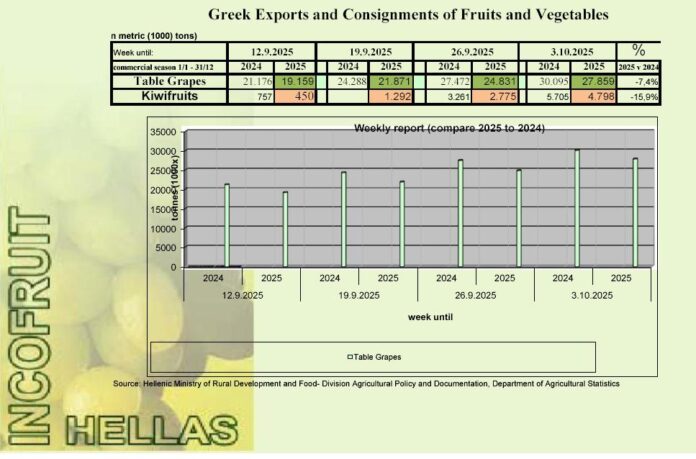 Συνεχίσθηκε η εξαγωγή επιτρ.σταφυλιών σε 27.859 τ. -7,4% έναντι 30.095 του 2024