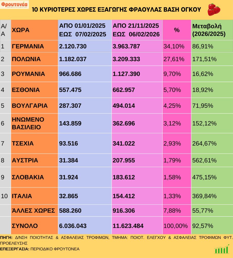 Θετική είναι η εικόνα των εξαγωγών φράουλας έως και την έκτη εβδομάδα του νέου έτους, συγκριτικά με το αντίστοιχο χρονικό διάστημα πέρυσι. Όπως παρατηρείται και στον πίνακα, η φετινή χρονιά σηματοδοτεί μια αύξηση ύψους + 92,57%.