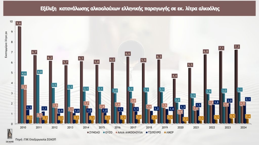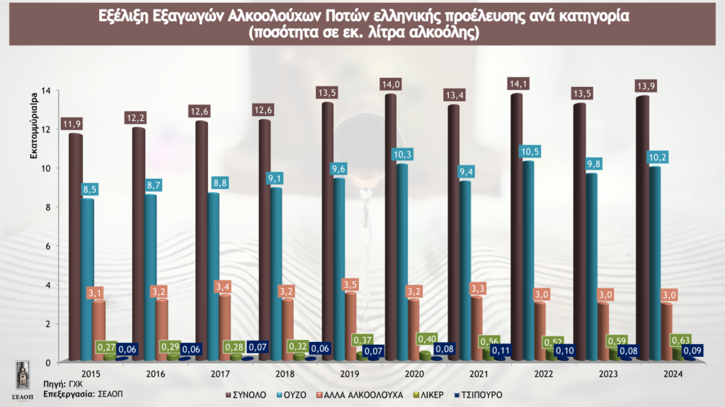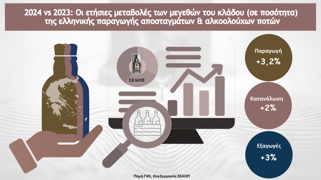Το 2024 ο κλάδος των ελληνικών αλκοολούχων ποτών επανήλθε σε ανοδική πορεία, μετά τη πτώση του 2023. Η συνολική παραγωγή έφτασε τα 21,4 εκατομμύρια λίτρα καθαρής αλκοόλης, καταγράφοντας αύξηση +3,2% (+0,7 εκ. λίτρα αλκοόλης) σε σχέση με το 2023 και συνολική άνοδο άνω του +20% στη διάρκεια της τελευταίας δεκαετίας. Η εξαγωγική δραστηριότητα του κλάδου σημείωσε αύξηση, σε όρους όγκου κατά +3% (+0,4 εκ λίτρα αλκοόλης) και η κατανάλωση των εγχωρίως παραγομένων ποτών αυξήθηκε κατά +2%. (+0,1 εκ λ. αλκοόλης).