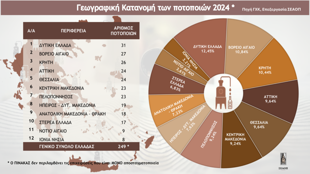 Με περίπου τριακόσιες μονάδες παραγωγής, η ελληνική ποτοποιία-αποσταγματοποιία παραμένει ένας ισχυρός παραγωγικός κλάδος, με καθιερωμένα εμπορικά σήματα και υψηλή αναγνωρισιμότητα, στηριζόμενος σε μεγάλο βαθμό στα αλκοολούχα ποτά με Γεωγραφική Ένδειξη, τα οποία αντιστοιχούν σε πάνω από το 70% της παραγωγής και σχεδόν στο 80% των εξαγωγών. Οι περισσότερες παραγωγικές μονάδες είναι μικρού και μεσαίου μεγέθους, οικογενειακού χαρακτήρα και διεσπαρμένες σε όλη την Ελλάδα, δημιουργώντας θέσεις εργασίας και στην ελληνική επαρχία, η οποία τις έχει τόσο μεγάλη ανάγκη.