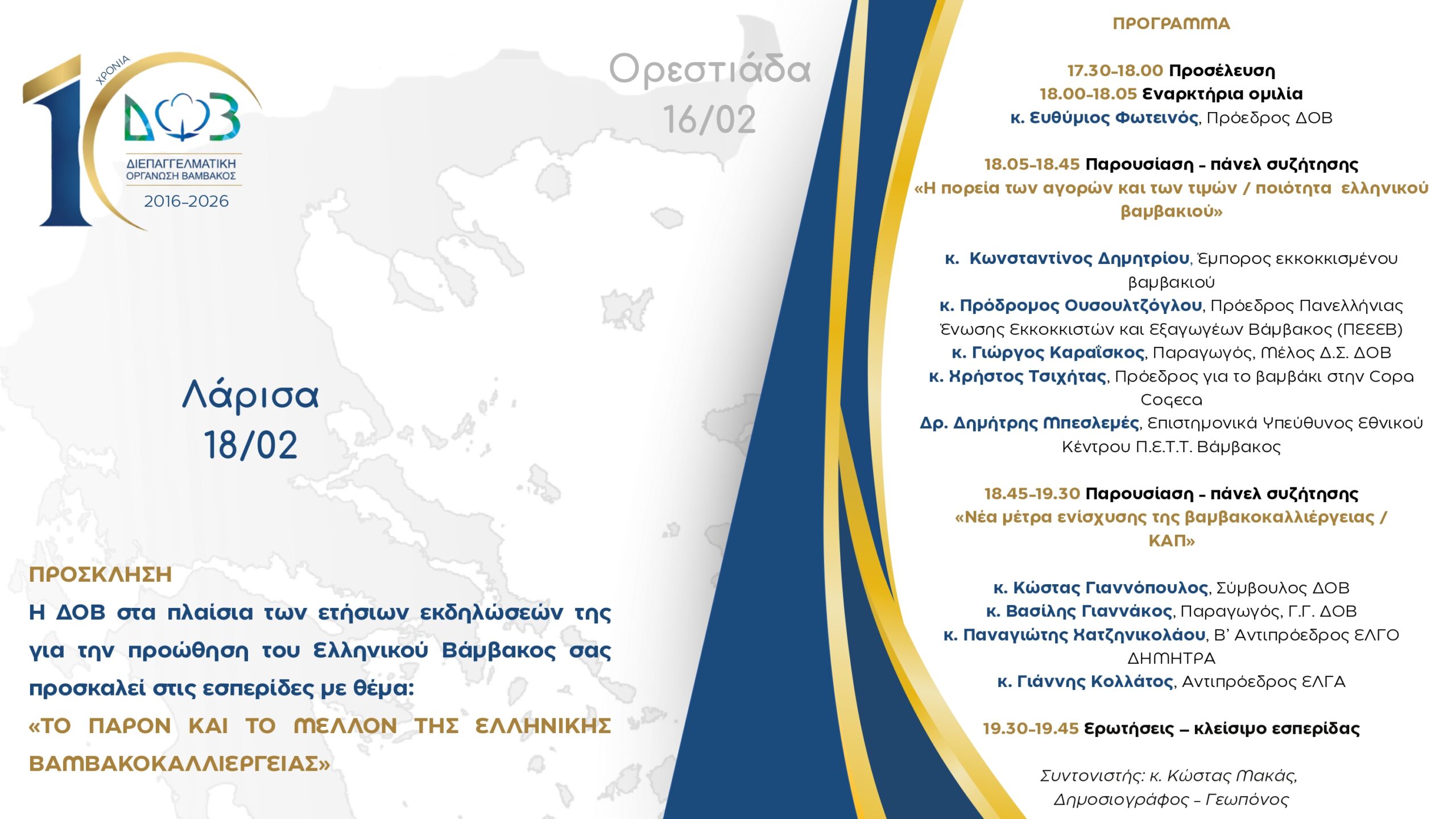 Την Τετάρτη 18 Φεβρουαρίου θα πραγματοποιηθεί η 2η εσπερίδα της Διεπαγγελματικής Οργάνωσης Βάμβακος για το 2026, στη Λάρισα (Ξενοδοχείο Grecotel Larissa Imperial) με τίτλο: «Το παρόν και το μέλλον της ελληνικής βαμβακοκαλλιέργειας» στα πλαίσια των ετήσιων εκδηλώσεων της Διεπαγγελματικής για την προώθηση του Ελληνικού Βαμβακιού.
