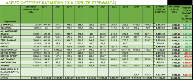 - Με τις ανωτέρω προϋποθέσεις, η απογραφείσα έκταση το 2024/25 στα 650.965 στρέμματα σε σύγκριση με το άθροισμα της έκτασης περιόδου 2015/16 (έναρξη του καθεστώτος Αδειών Φύτευσης) πλέον των χορηγηθεισών Αδειών Φύτευσης περιόδου 2016/17-2024/25 (627.734,4 στρ. + 55.037,88 στρ.= 650.965 στρ.), παρουσιάζει αρνητική διαφορά 31.807,28 στρεμμάτων, έκταση η οποία ερμηνεύεται ότι έχει εγκαταλειφθεί τα τελευταία εννέα χρόνια.