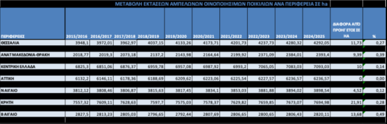 Σύμφωνα με τους πίνακες που ακολουθούν, οι οποίοι αφορούν τη διαχρονική μεταβολή των εκτάσεων αμπελοκαλλιέργειας ανά Περιφέρεια και τη χορήγηση Αδειών Φύτευσης