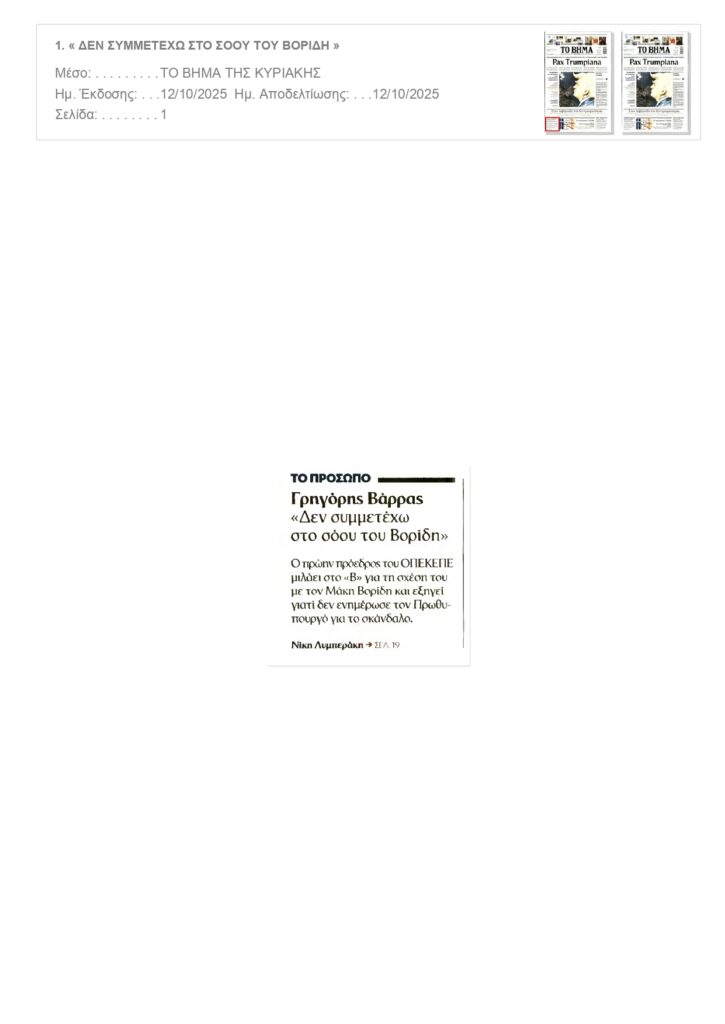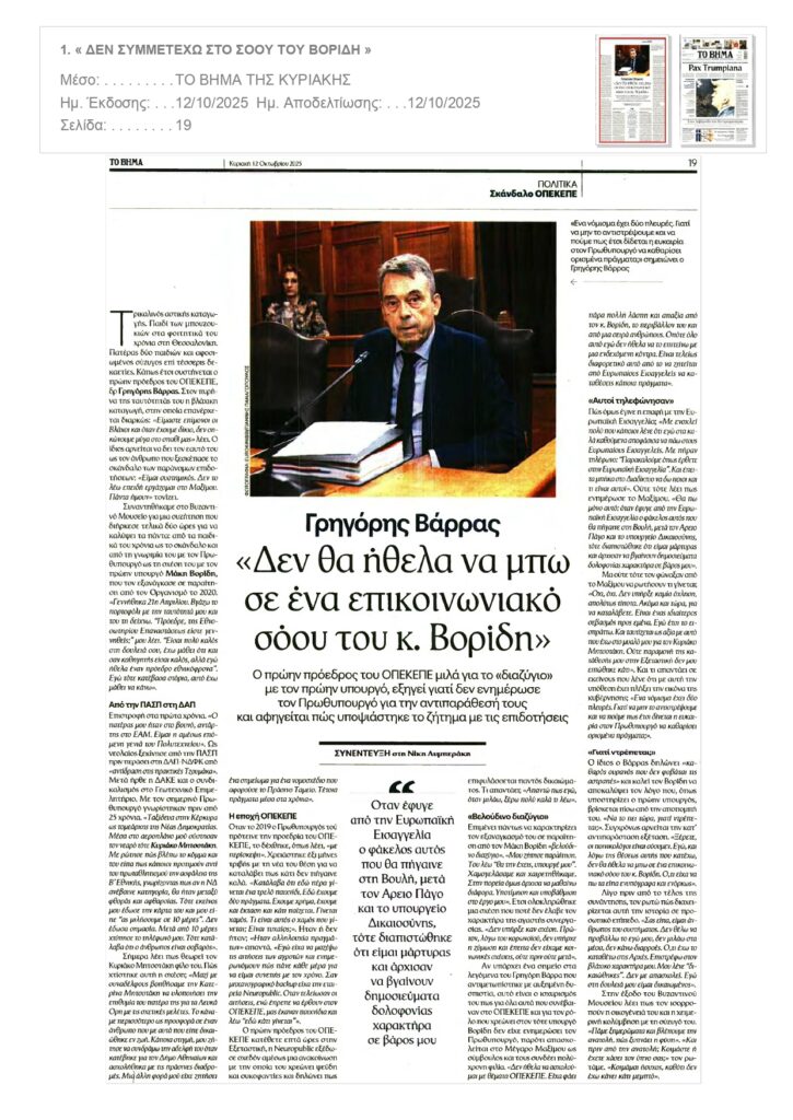 Συνέντευξη έδωσε ο κος Γ,Βάρρας στο Βήμα της Κυριακής.