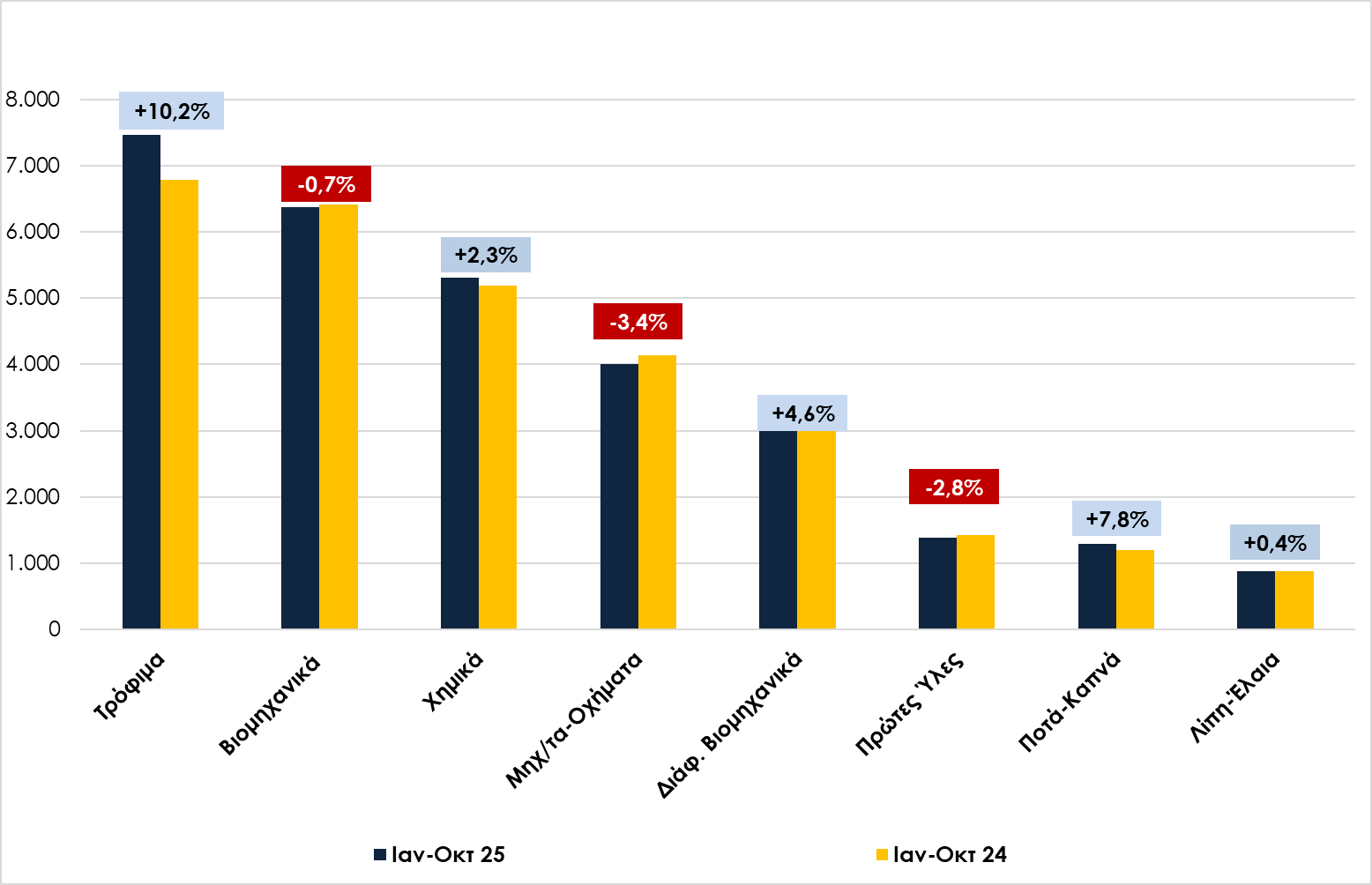 Σε κλαδικό επίπεδο (Πίνακας 4), ο κλάδος των τροφίμων κατέγραψε τη μεγαλύτερη αύξηση σε απόλυτες τιμές, σημειώνοντας άνοδο €688,6 εκατ. ή 10,2%, επιβεβαιώνοντας τη συνεχιζόμενη δυναμική του στις διεθνείς αγορές. Αξιοσημείωτη αύξηση παρουσίασαν επίσης τα διάφορα βιομηχανικά είδη, με ενίσχυση €137,0 εκατ. (4,6%), καθώς και ο κλάδος των χημικών προϊόντων, που σημείωσε άνοδο €120,8 εκατ. ή 2,3%. Θετική ήταν και η συμβολή του κλάδου των ποτών–καπνών, ο οποίος ενισχύθηκε κατά €92,9 εκατ. ή 7,8%, ενώ στα λίπη–έλαια καταγράφηκε οριακή αύξηση €3,8 εκατ. ή 0,4%. Ενίσχυση σημείωσαν επίσης τα μη ταξινομημένα προϊόντα, τα οποία αυξήθηκαν κατά €17,9 εκατ. ή 16,7%. Αντιθέτως, ο κλάδος των πετρελαιοειδών παρουσίασε τη μεγαλύτερη μείωση, τόσο σε απόλυτες όσο και σε ποσοστιαίους όρους, σημειώνοντας πτώση €2.344,9 εκατ. ή 18,5%, γεγονός που επηρέασε καθοριστικά το συνολικό αποτέλεσμα των εξαγωγών. Πτωτικά κινήθηκαν επίσης τα μηχανήματα–οχήματα (€-141,1 εκατ., -3,4%) και τα βιομηχανικά προϊόντα (€-47,0 εκατ., -0,7%), ενώ μείωση κατέγραψαν και οι πρώτες ύλες (€-40,4 εκατ., -2,8%).