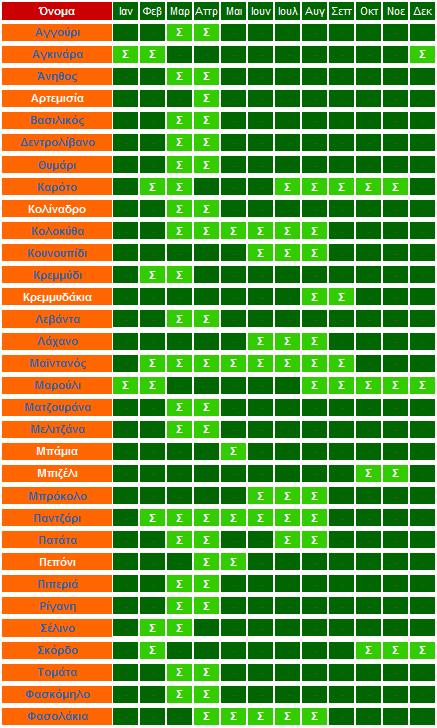 Στον πίνακα που ακολουθεί μπορείτε να δείτε τι σπέρνουμε, τι φυτεύουμε και τι μεταφυτεύουμε ανά μήνα.