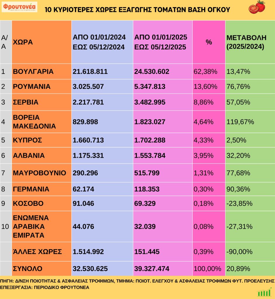 Με ανοδική πορεία συνεχίστηκαν οι εξαγωγές τοματών έως και 5.12.25, οι οποίες είναι αυξημένες κατά 20,89% σε σχέση με την αντίστοιχη περσινή περίοδο.