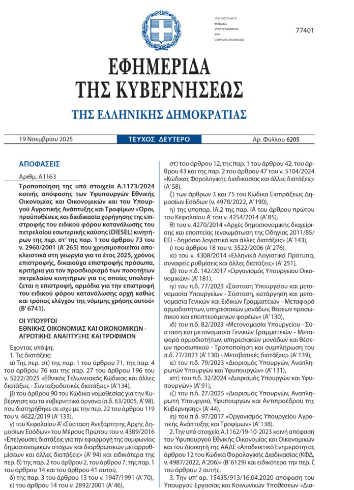 Βγήκε το νέο ΦΕΚ με τις αυξήσεις στο αγροτικό πετρέλαιο